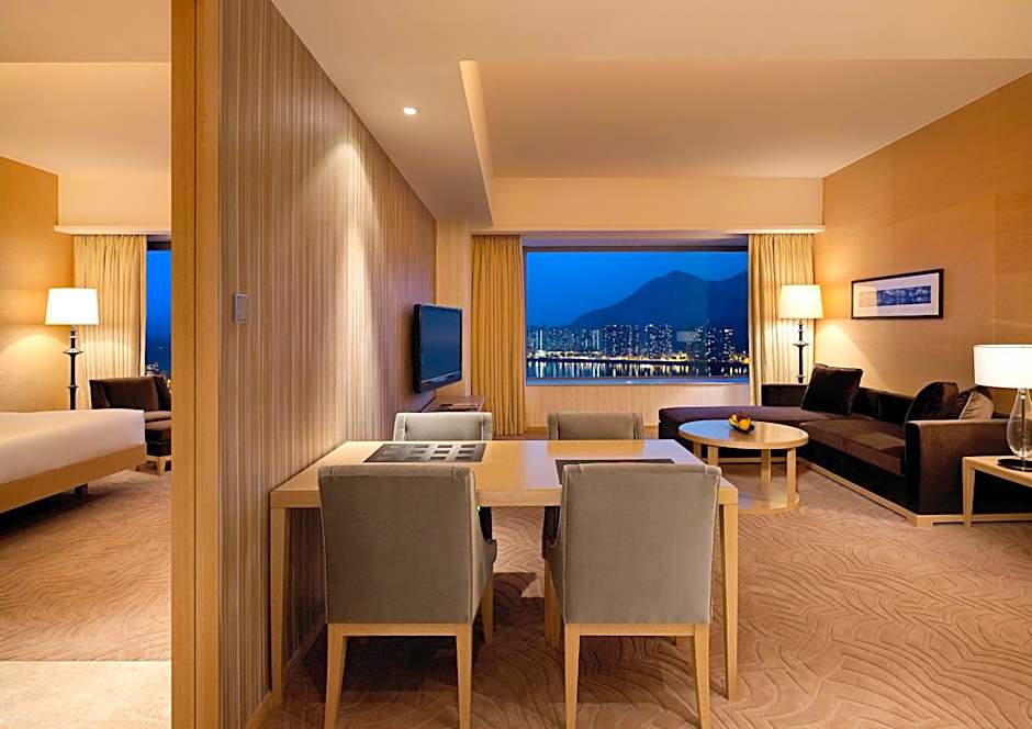 Offering harbor views, this 36-square-yard room comes with twin beds and writing desk with enhanced lighting, a bathroom with glass wall with a TV, alongside a separate rainshower. It also has contemporary decor with photographic montages of old and new Hong Kong, plus 42-inch multi-channel LCD flat-screen TV and wired and wireless broadband internet access.